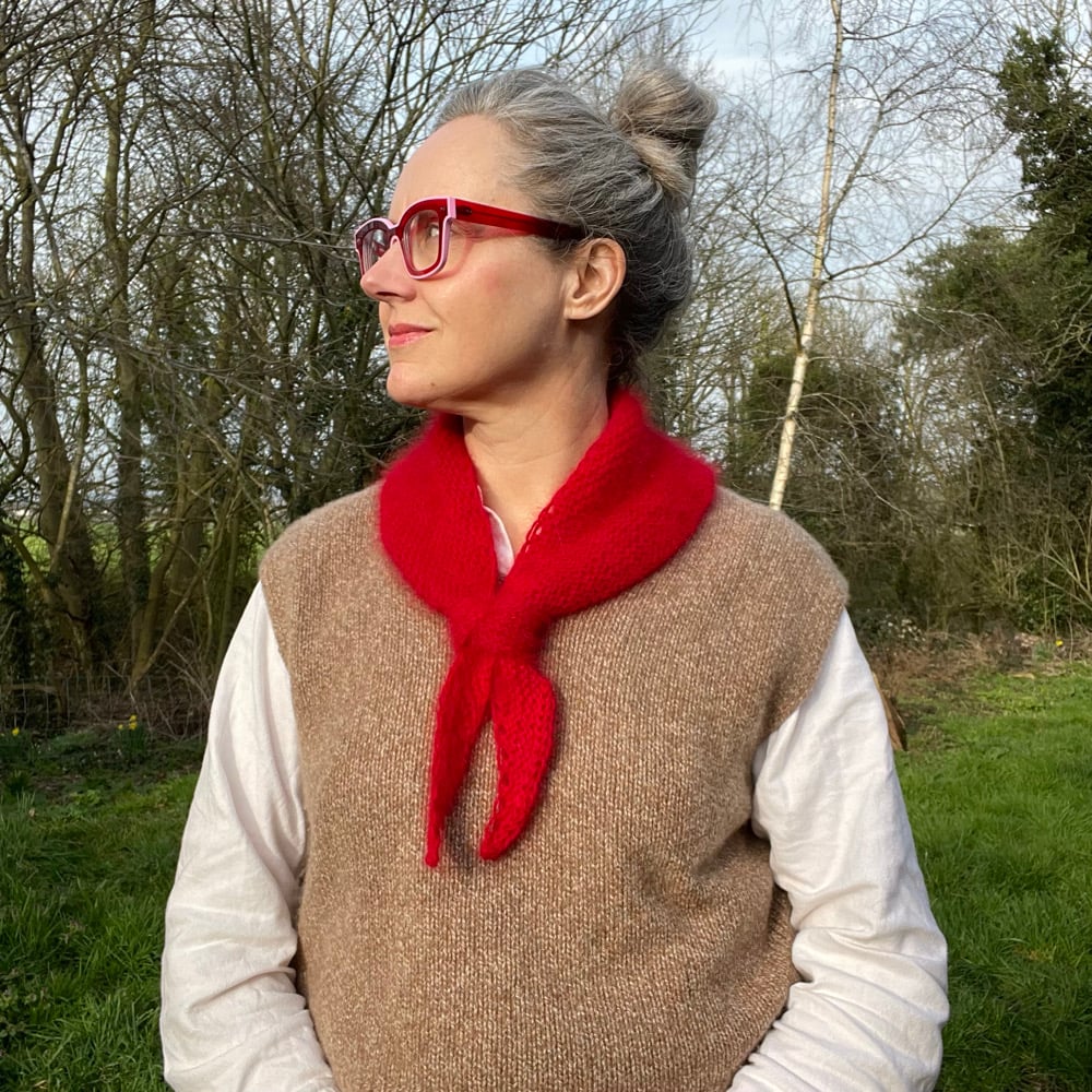 Scalene scarf hand knit by me in pristine 1950’s Tinkerbell yarn. A bias scalene triangle - all sides different lengths - garter stitch scarf in scarlet. Its elongated so perfect for knotting and has an eyelet edge along the longest side. I found this 70 year old yarn in it’s original packaging, it had obviously been treasured. Made myself a hat and decided the remainder shouldn’t sit for another 70 years. It is incredibly fluffy! I have never come across a modern yarn with so much of a halo but that’s because it’s 75% Angora with 25% nylon for strength.