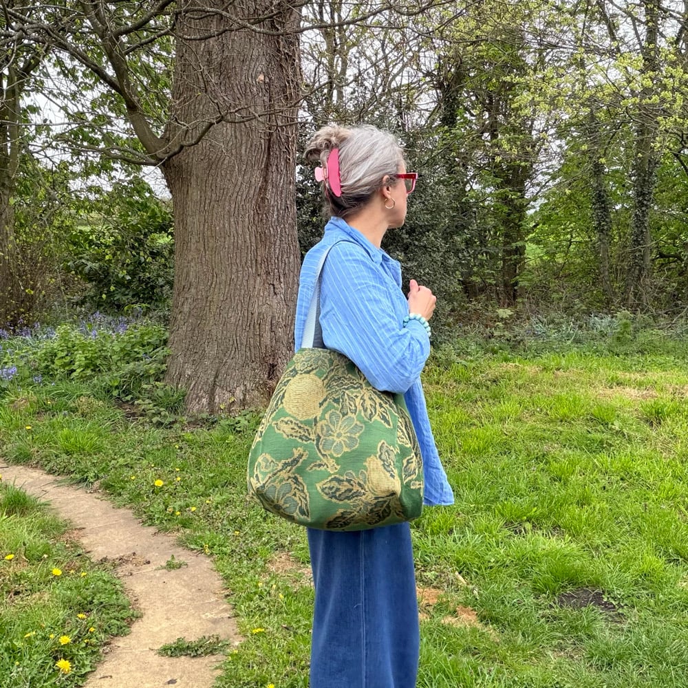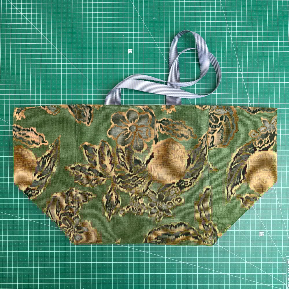 Cube Tote bag made from a vintage upholstery fabric. Lined in green wool twill with selvedge pocket.