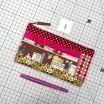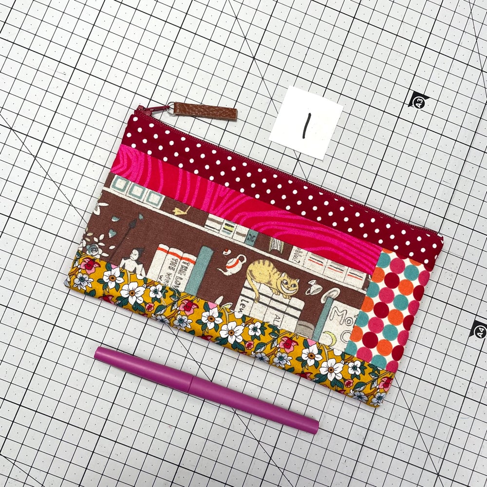 Patchwork pouch with wool batting, cotton lining, red zip with leather pull.