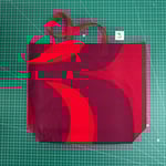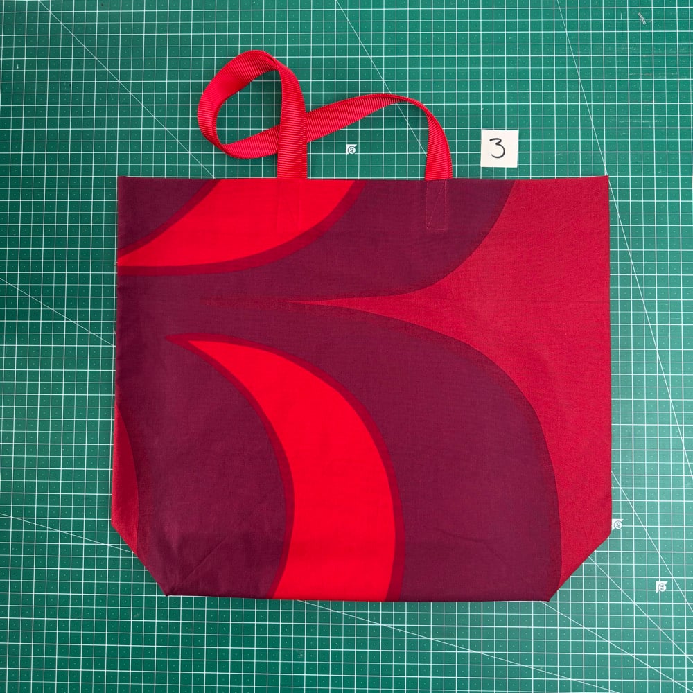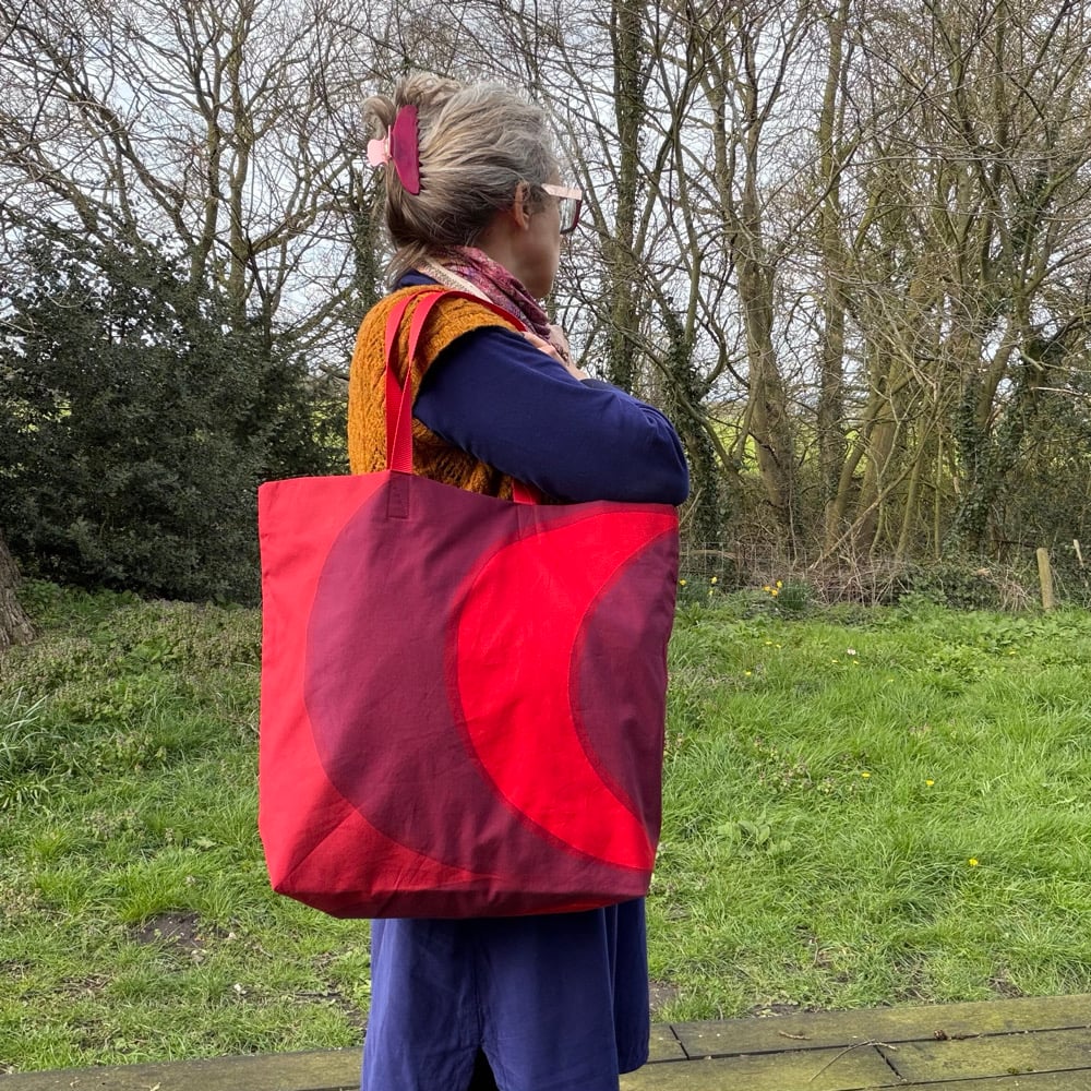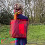 Tote bag made from red cotton print curtains and lined with a putty coloured cotton that was formerly a curtain lining. Red webbing handles.