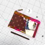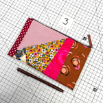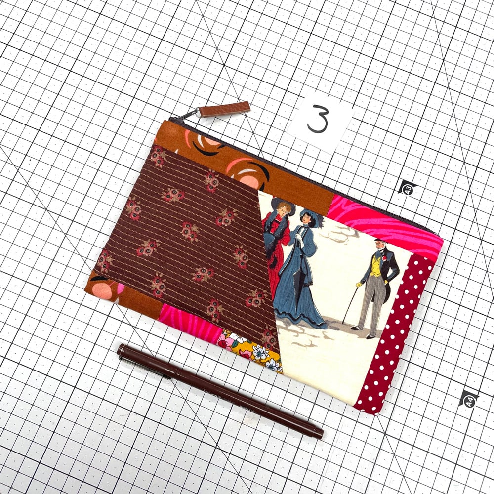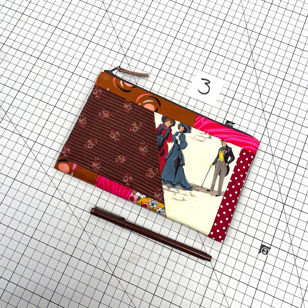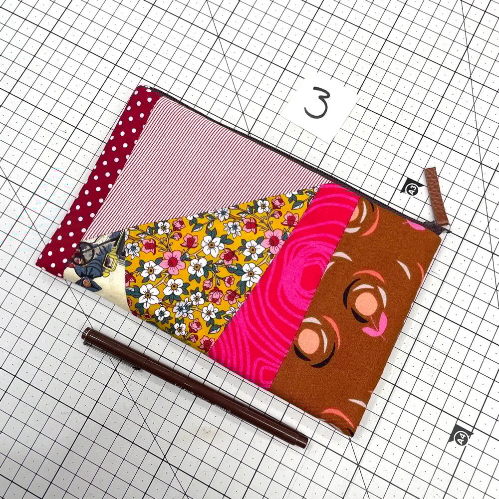 Patchwork pouch with wool batting, cotton lining, red zip with leather pull.