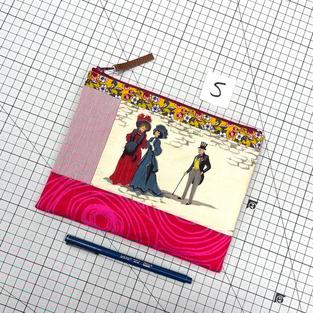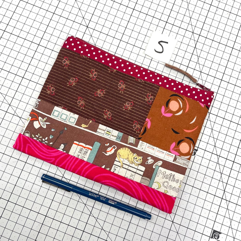Patchwork pouch with wool batting, cotton lining, red zip with leather pull.