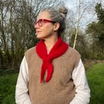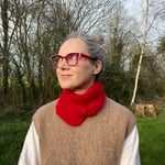Scalene scarf hand knit by me in pristine 1950's Tinkerbell yarn. A bias scalene triangle - all sides different lengths - garter stitch scarf in scarlet. I found this 70 year old yarn in it's original packaging, it had obviously been treasured. Made myself a hat and decided the remainder shouldn't sit for another 70 years. It is incredibly fluffy! I have never come across a modern yarn with so much of a halo but that's because it's 75% Angora with 25% nylon for strength.