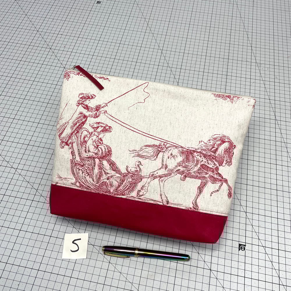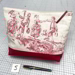 Vintage toile de jouy pouch. Red waxed cotton base, gold denim lining, taupe zip with red leather pull.