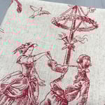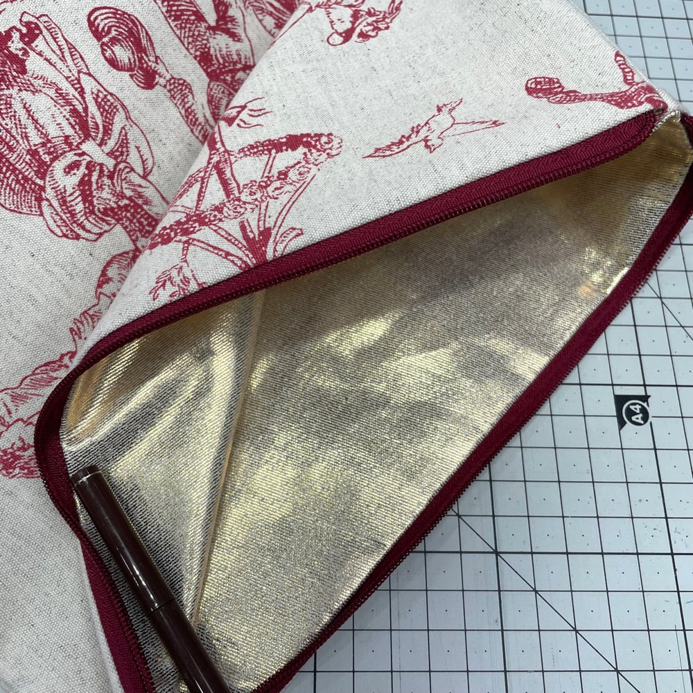 Vintage toile de jouy pouch. Red waxed cotton base, gold denim lining, red zip with red leather pull.