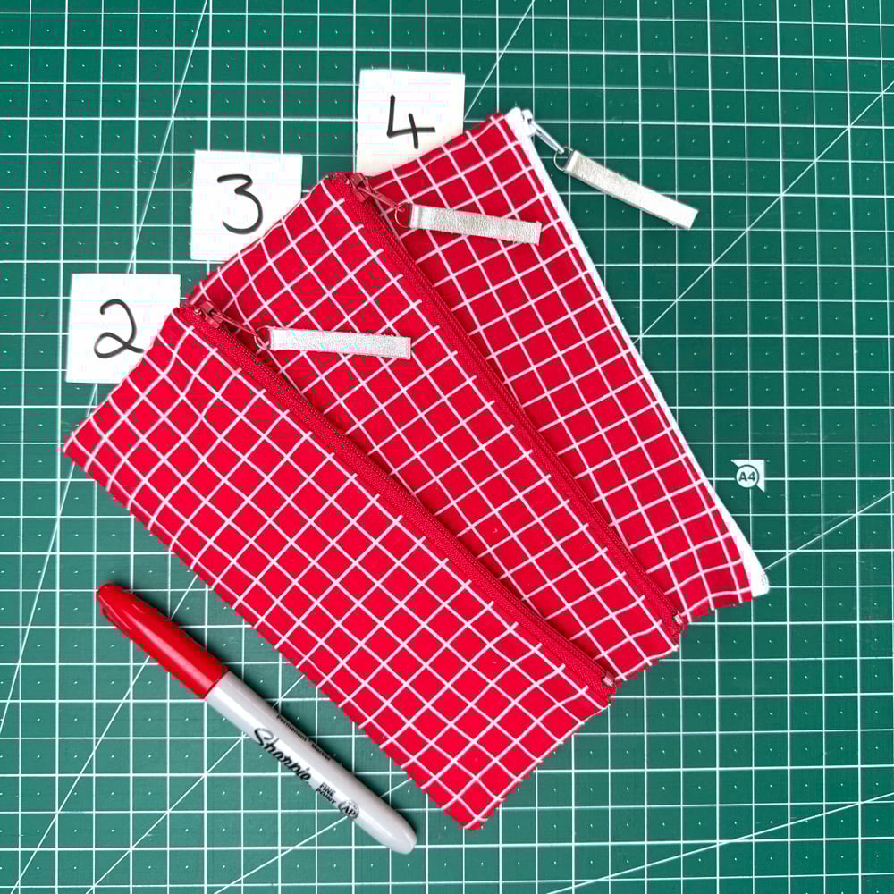 4. 7.25" x 2.75" Red cotton lining, white zip